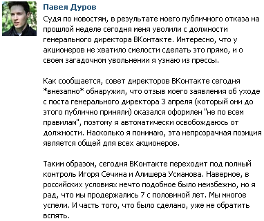 Прошло несколько дней и оказалось, что Павел Дуров якобы не правильно оформил заявление от 3 апреля, и совет директоров принял решение об увольнении его с поста Генерального Директора «Вконтакте». Сейчас популярная соцсеть переходит под контроль руководителя компании «Роснефть» Игоря Сечина и руководителя USM Holdings Алишера Усманова.