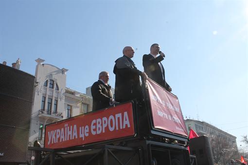 Примерно 100 пророссийски настроенных активистов, которые во время выступления политика находились за сценой, под крики «Россия» и «Фашизм не пройдет» начали бросать яйца в спину Кличко. Ребята из охраны прикрыли Виталия зонтами.
