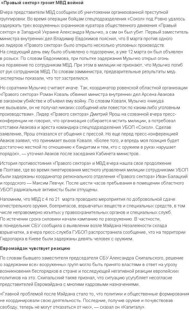 Вчера стало известно о гибели одного из лидеров «Правого сектора» Александра Музычко, который был убит во время задержания представителями правоохранительных органов. Убийство Музычко может спровоцировать конфликт между радикальными активистами и силовиками. Если конфликт не удастся решить мирным путем, то он может привести к углублению гражданского противостояния в Украине.