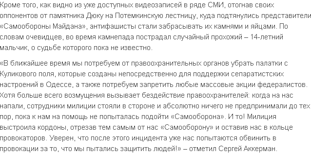 «Мы пошли отозвать своих людей, чтобы они не шли к Дюку, а остальных, кто не успеет, — защитить от «антимайдановцев». На Приморском бульваре агрессивная часть активистов «антимайдановцев» старалась спровоцировать «евромайдановцев», поэтому мы стали защищать их и портреты Небесной Сотни, чтобы те не уничтожили. Представители «антимайдановцев» начали нас окружать, и мы решили понемногу отступать, но несколько наших людей все же побили: четырем представителям «Правого сектора» нанесли телесные повреждения, также пострадал один активист «Евромайдана». После драки «антимайдановцы» сожгли портреты Небесной Сотни», — рассказал Сергей Аккерман.