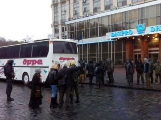 Представители «Правого сектора» покидали гостиницу «Днепр» небольшими группками, они садились в большие туристические автобусы, которых на месте события было не менее пяти.