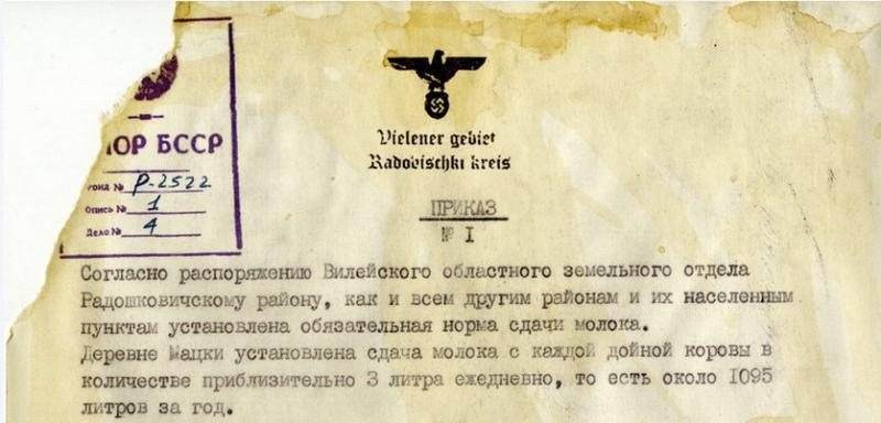 Один из них – это приказ Вермахта населению деревни Мацки, которая располагается недалеко от столицы Белоруссии города Минска. В нем говорится о том, что крестьяне обязаны сдавать по три литра молока с каждой коровы ежедневно, а начальнику полиции Януковичу было поручено следить за исполнением этого приказа.