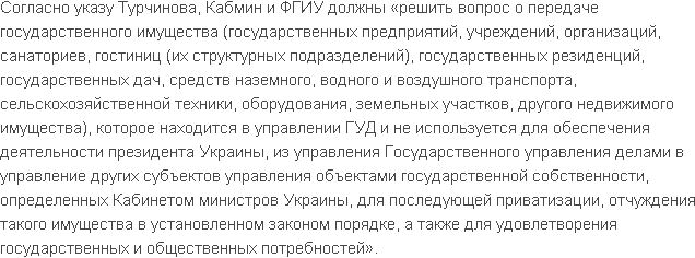 Также Турчинов поручил Фонду государственного имущества Украины ускорить приватизацию частного акционерного общества «Президент-отель», управление корпоративными правами которого передано Фонду согласно распоряжению Кабинета министров Украины от 1 октября 2012 года № 726-р.