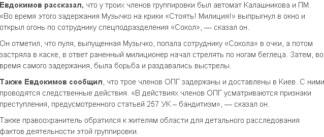 Владимир Евдокимов утверждает, что во время задержания Музычко открыл огонь, и представители правоохранительных органов в ответ начали стрелять по ногам, а потом, во время самого задержания, раздавались выстрелы.